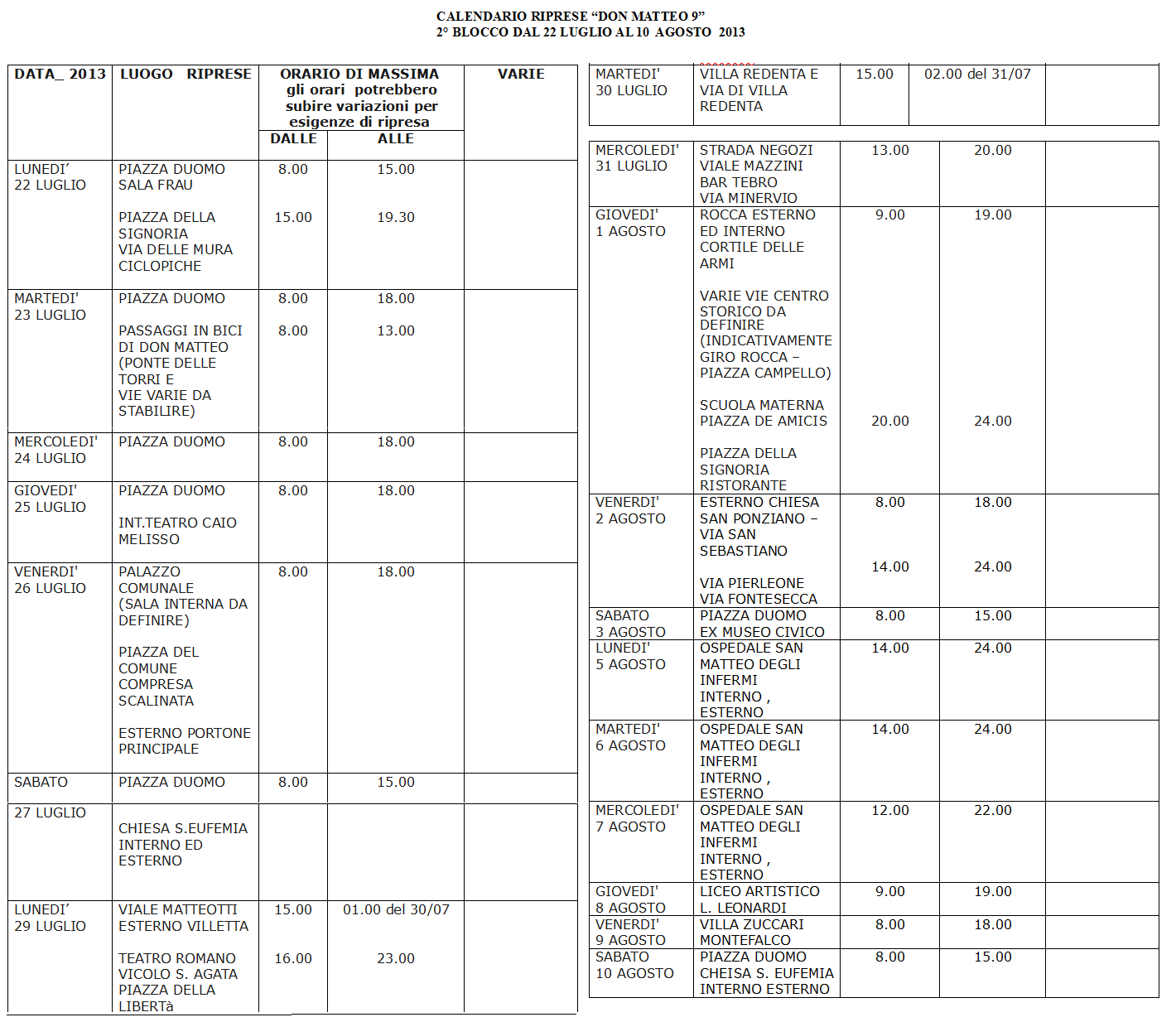 Un gentile fan (di cui omettiamo il nome per ragioni di privacy), ci ha inviato poco fa, il programma dettagliato delle riprese a Spoleto per il periodo 22 luglio-10 agosto.