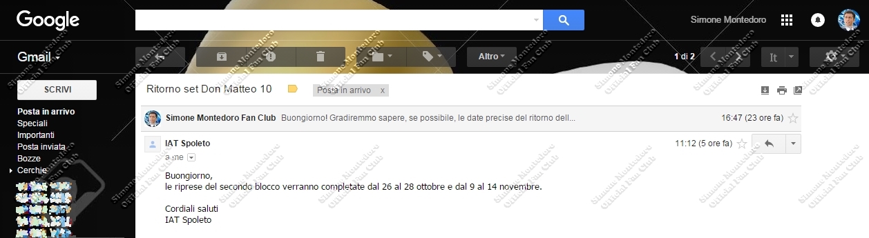 "Buongiorno, le riprese del secondo blocco verranno completate dal 26 al 28 ottobre e dal 9 al 14 novembre. Cordiali saluti IAT Spoleto"