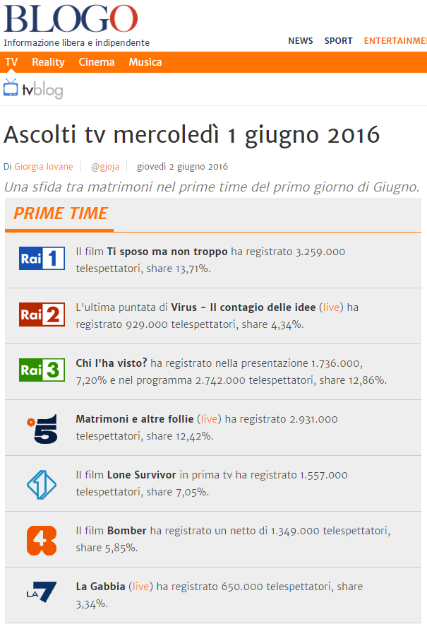 Ascolti prima puntata di "Matrimoni e altre follie"
