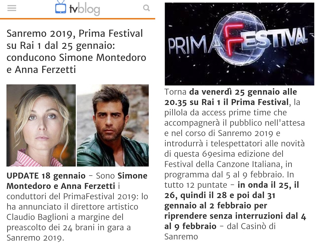 Grande notizia UFFICIALE! Saranno Simone e Anna Ferzetti i conduttori di Prima Festival 2019: lo ha annunciato il direttore artistico del Festival di Sanremo, Claudio Baglioni in conferenza stampa. Le puntate, andranno in onda dal 25 gennaio al 9 febbraio. Le puntate dal 4 al 9 febbraio saranno in diretta dal red carpet del Teatro Ariston il tutto dopo il TG1 su Riauno. Le date del tour teatrale sono state spostate come da post aggiornato QUI sotto. News grazie a TVBlog